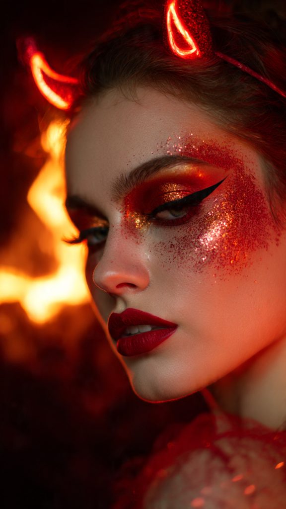 Finish with bold red lipstick, sculpted brows, and (if you’re feeling extra) a touch of red glitter along your cheekbones. Add horns or a red outfit, and you’re officially the hottest devil in the room.
