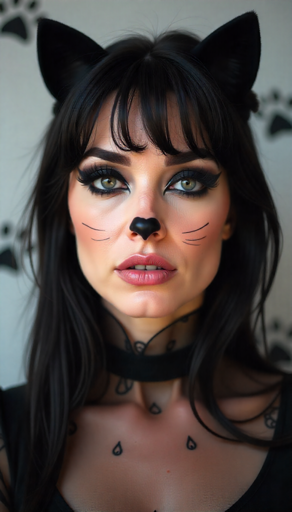 Draw small whiskers with a thin eyeliner brush, add a cute black nose, and a touch of pink blush on your cheeks. A nude or soft pink lip complements the feline aesthetic perfectly. Don’t forget your cat ears and maybe a little shimmer highlighter on the nose bridge — it’s simple but timeless!