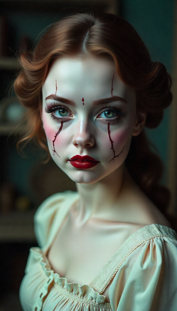 If creepy-cute is your thing, the haunted doll look is a must-try. Go for a porcelain-smooth base, exaggerated blush, and bright eyeshadow. Draw faint cracks on your cheeks and forehead with black eyeliner to mimic broken porcelain.