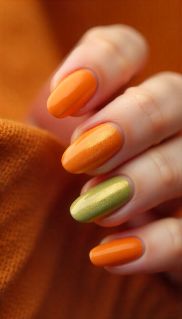Warm orange tones mixed with a touch of golden shimmer make your nails look deliciously cozy.