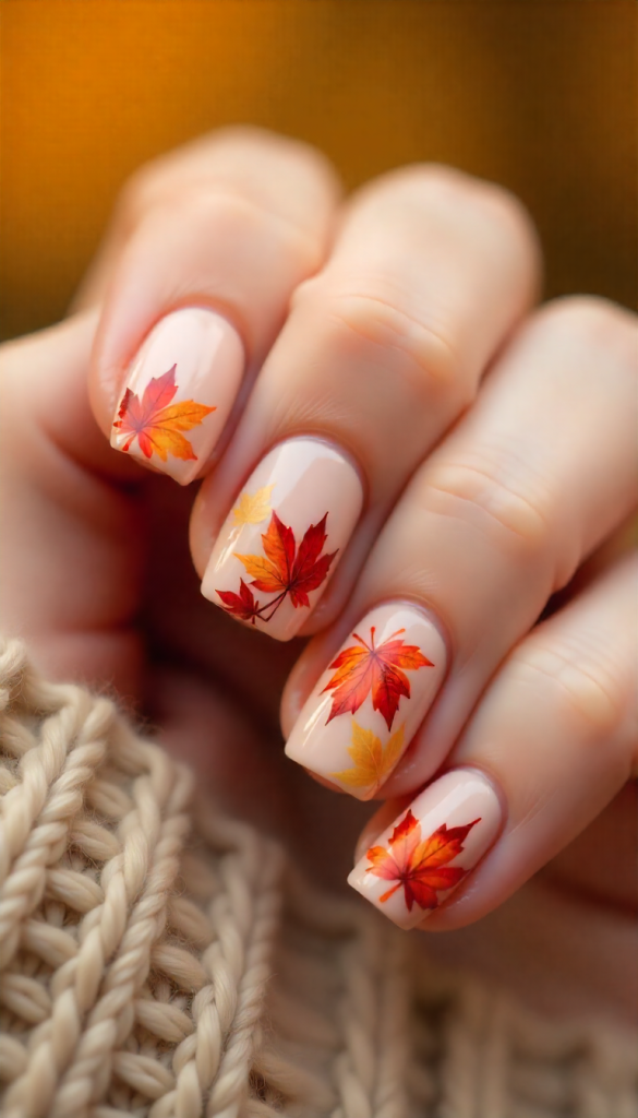 Start with a nude or beige base and add delicate red, gold, and orange leaves.