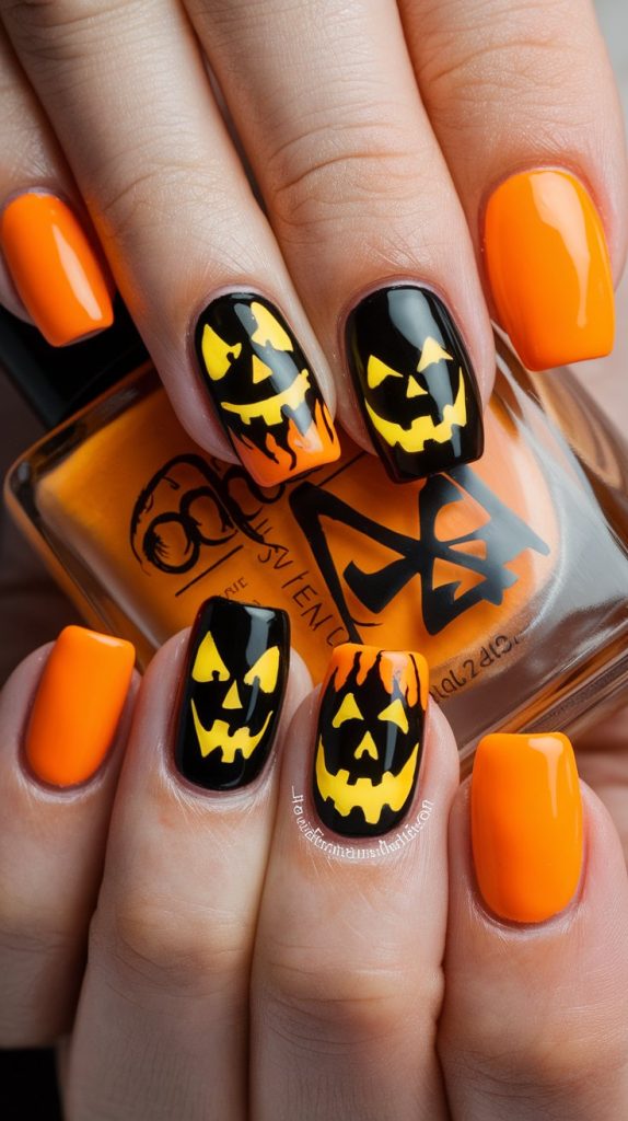 A mix of matte orange polish and glossy black details makes the pumpkins pop in every lighting.