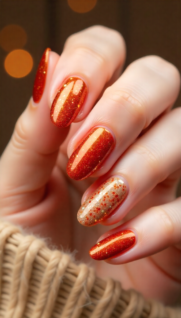 Mix bronze, gold, and burnt orange glitter for the ultimate fall-inspired Halloween nail look.