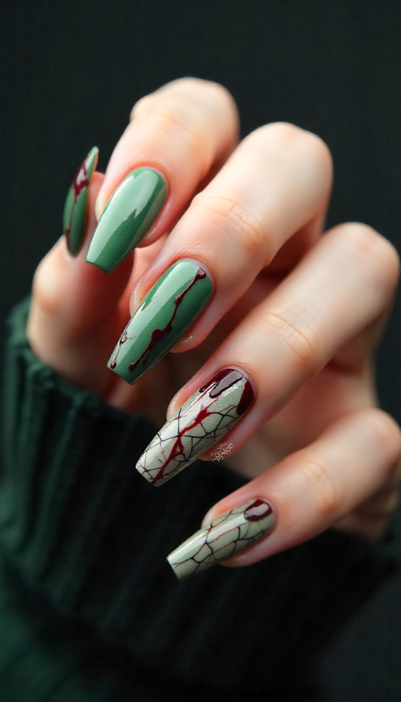 Add subtle black veins, cracked details, or matte finishes for extra depth and realism. These Zombie Drip Nails are bold, creepy, and totally unforgettable — a killer choice for Halloween Nail Ideas 2025.
