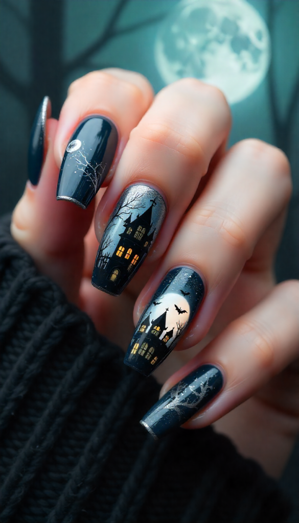 Transform your manicure into a spooky masterpiece with Haunted Mansion Nails. Dark blue or smoky grey backgrounds set the stage for intricate hand-painted details — tiny glowing windows, fluttering bats, eerie ghosts, and misty moonlit skies.