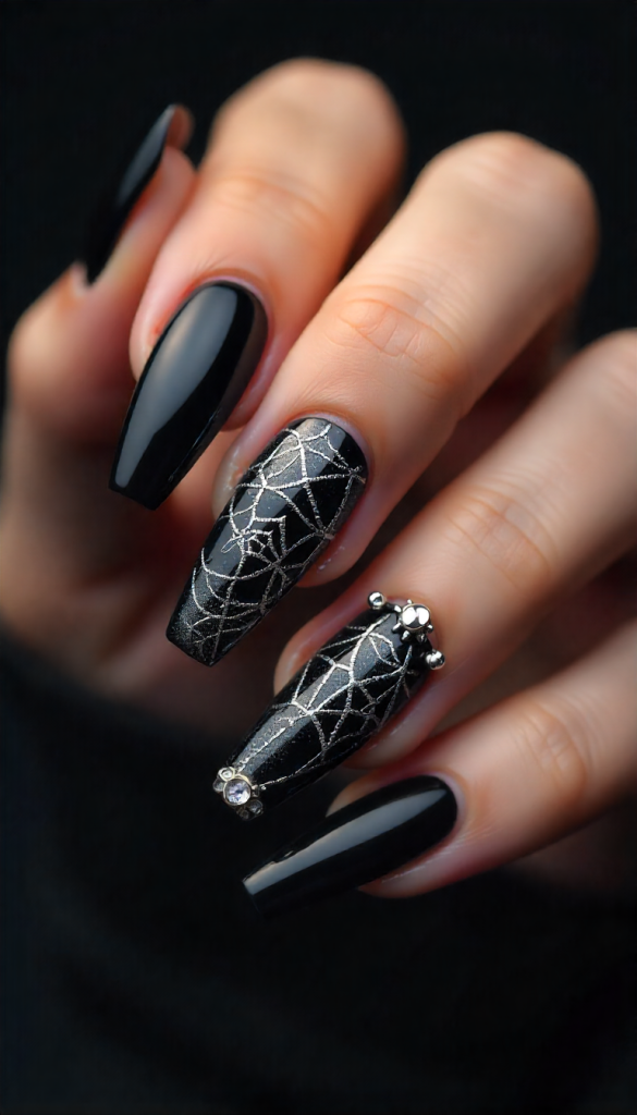 Start with a glossy black or deep plum base, then add 3D silver or gold spider charms, metallic webs, or gemstone accents for extra sparkle.
