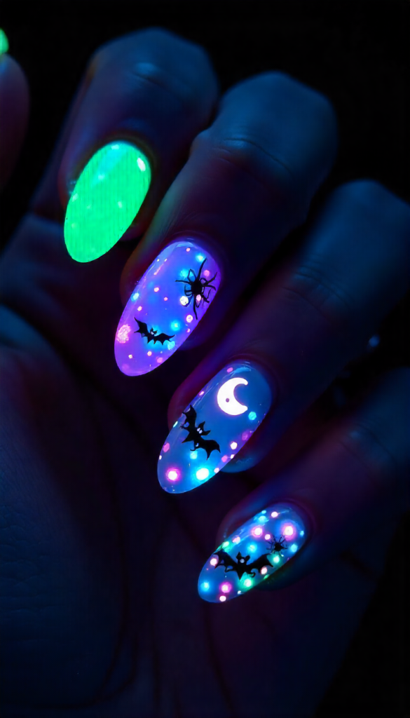 For extra flair, add ghost, bat, or spider web details that come alive in the dark. Fun, spooky, and eye-catching, Glow-in-the-Dark Nails bring playful magic to Halloween Nail Ideas 2025, making your manicure the life of the night!