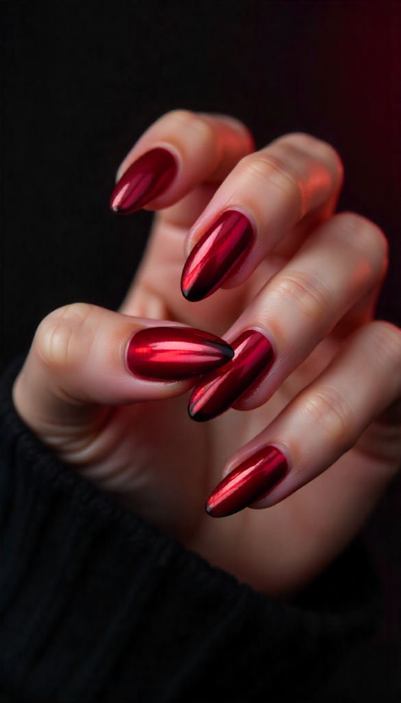 Deep, shiny red chrome gives your manicure a seductive, vampy touch — perfect for channeling dark elegance this Halloween.