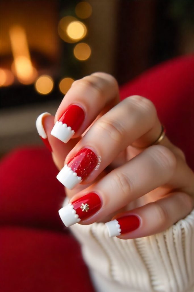 A playful twist on French tips — swap white for fuzzy Santa hat details in red and white. This design is cute, trendy, and perfect for spreading Christmas cheer.