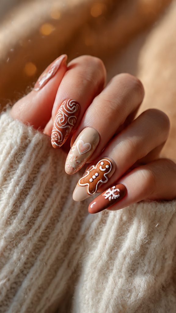 Brown and tan shades with adorable gingerbread man art make for the sweetest nail look ever. Add white icing-like swirls for a cozy, homemade feel.