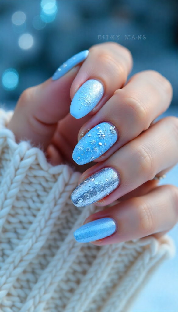 Step away from traditional red and green with icy blue tones and snowflake accents. This frosty design feels chic and modern — like winter wonderland vibes for your hands.