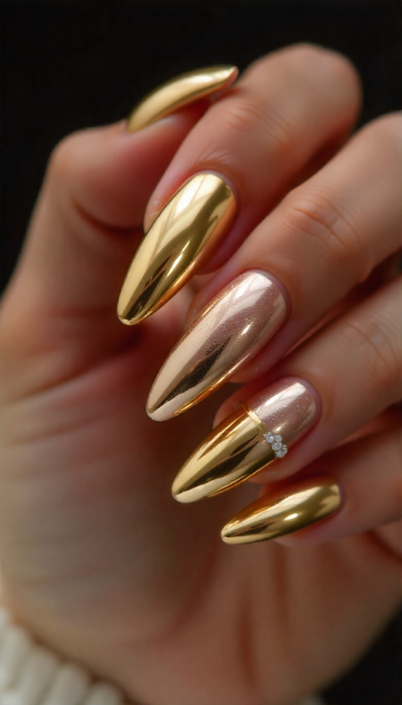 Metallic gold chrome screams Christmas luxury. These nails look elegant on any shape and are perfect for holiday parties or New Year’s celebrations.