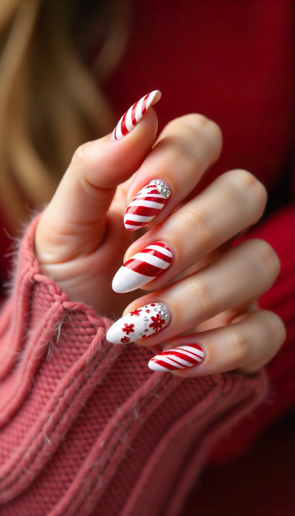 Red and white stripes never fail to bring sweet holiday vibes. Add a touch of glitter or a green accent nail to make it pop even more.