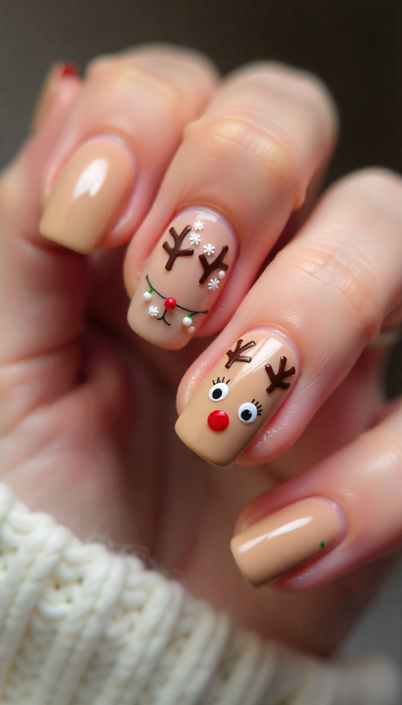 Adorable little reindeer faces with shiny red noses bring out your playful side. Pair them with nude or light brown tones to keep the look balanced and cute.