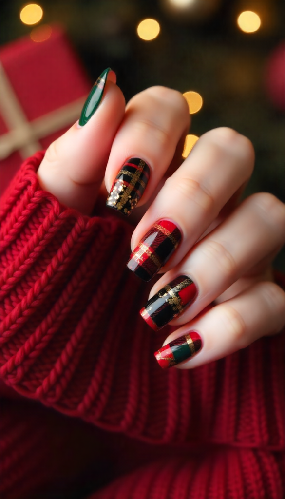 Classic red and green plaid patterns are giving major cozy sweater energy. Top with a matte finish for a soft, fabric-like texture.