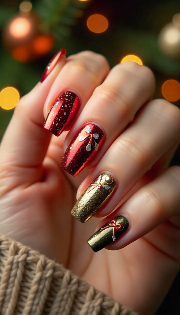 Add tiny ornament designs with metallic polish or 3D gems for a festive sparkle. Each nail can showcase a different ornament pattern for extra creativity.