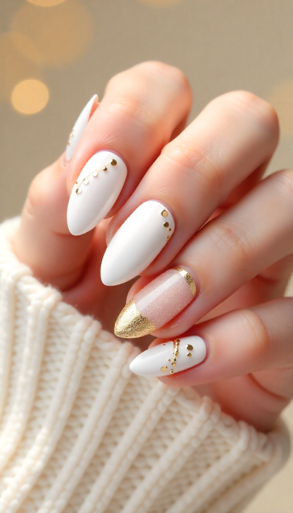 Soft white nails with gold flakes or foil give a refined, angelic look. This combo works beautifully for formal events or winter weddings.