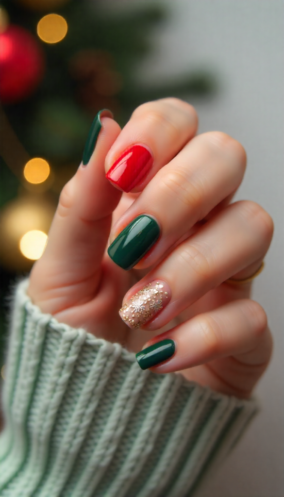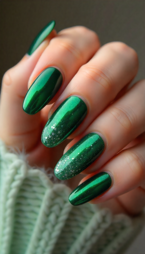 Blend dark emerald green into gold glitter tips for a stunning, holiday-ready ombre. It’s festive, chic, and pairs beautifully with all your Christmas outfits.