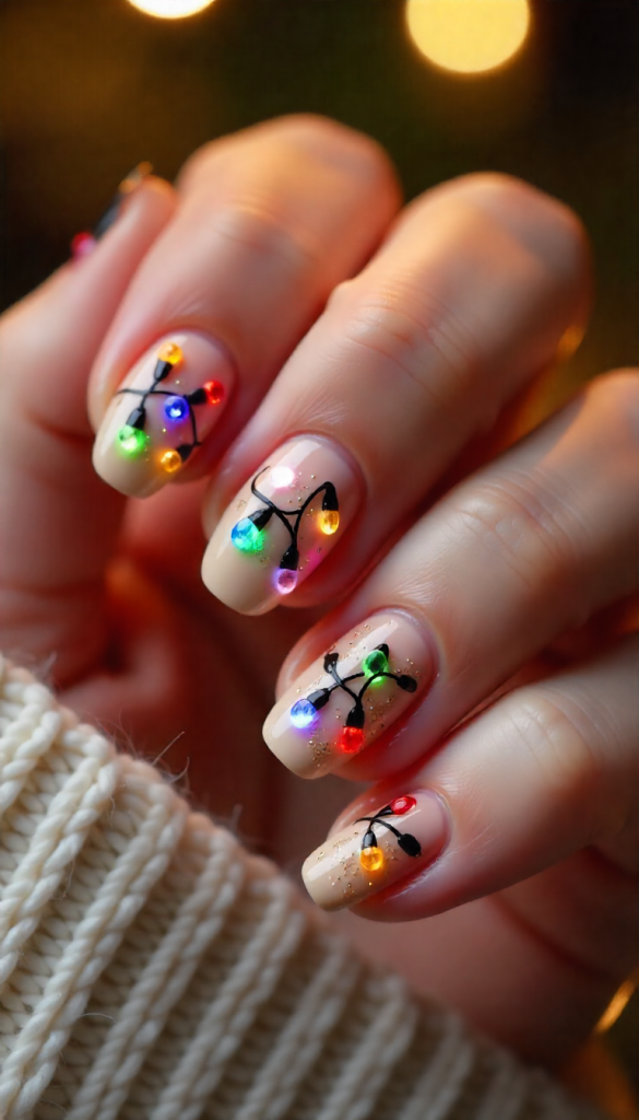 Tiny, colorful string lights painted across nude nails are cheerful and fun. It’s the perfect design if you want something bright and whimsical.