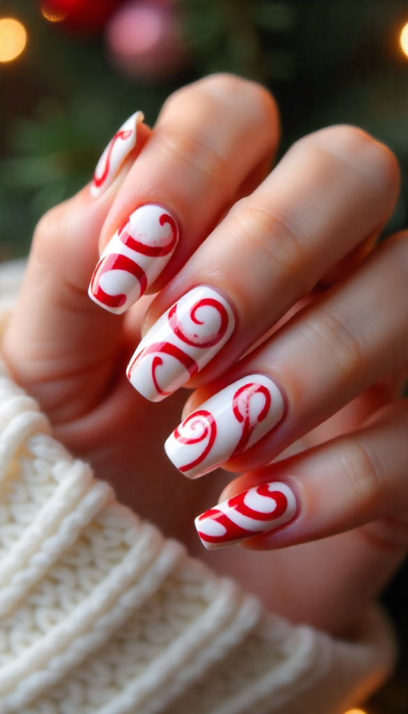 Red and white spirals give your nails a candy-fresh vibe. Add a glossy finish to make them look good enough to eat (but don’t!).