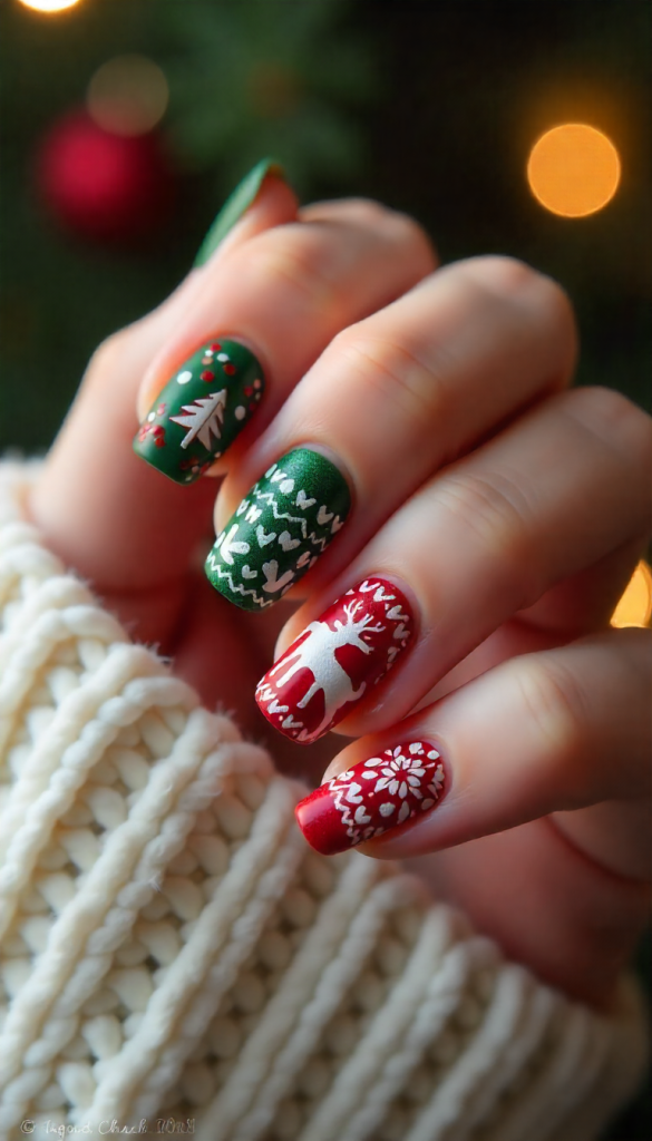 Turn your favorite holiday sweater into nail art with fun patterns like reindeer, snowflakes, and hearts. This design is quirky, nostalgic, and full of Christmas cheer.