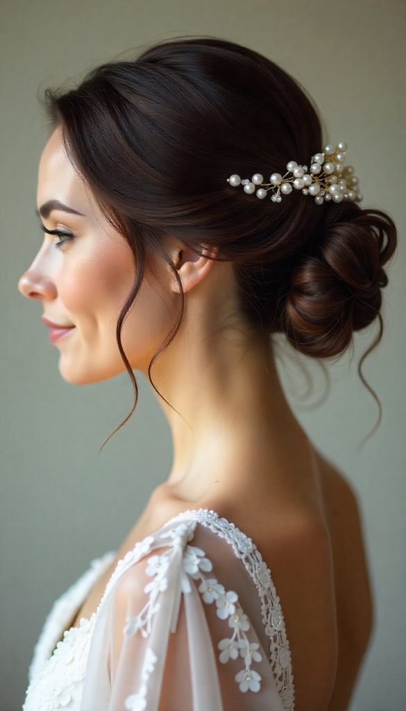 A slightly undone bun adorned with statement hair accessories—pearl combs, crystal pins, or floral clips. Accessories elevate the messy bun to bridal couture level.