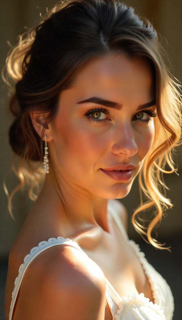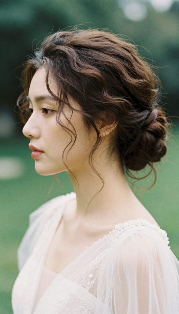 A soft low bun at the nape of the neck, with gentle, face-framing tendrils and delicate volume. This style exudes timeless romance and pairs beautifully with lace or tulle gowns.