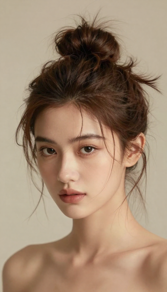 A high, voluminous messy bun with textured waves and subtle twists. This hairstyle is dramatic yet chic, giving height and elegance without feeling stiff.