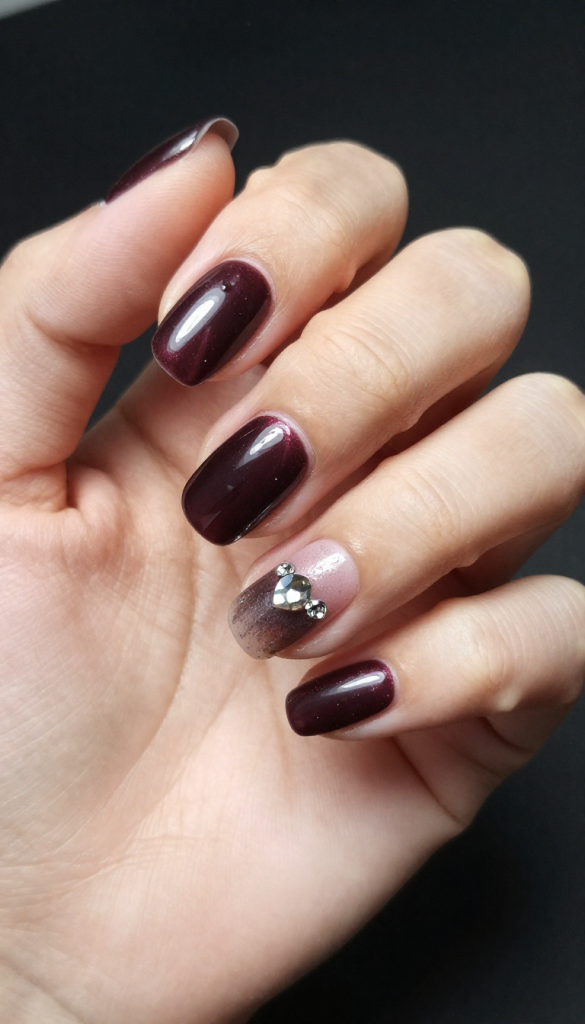 Dark plum chrome nails offer a rich, moody base enhanced with a high-shine chrome overlay. Micro crystal accents are delicately placed near the cuticle or along one edge to add sparkle without overwhelming the design. The contrast between the smooth metallic surface and the faceted crystals elevates this look into true luxury nail art.