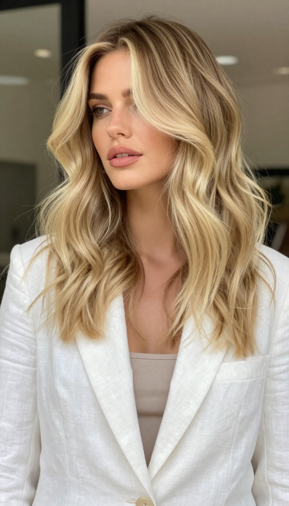 This style features a slightly deeper root that melts into creamy blonde lengths. The balayage technique creates natural movement and depth, mimicking sun-kissed highlights.