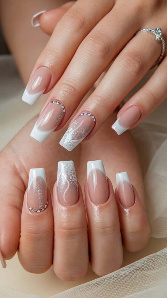 5. Crystal Accent Glamorous French Tips Bridal Nails