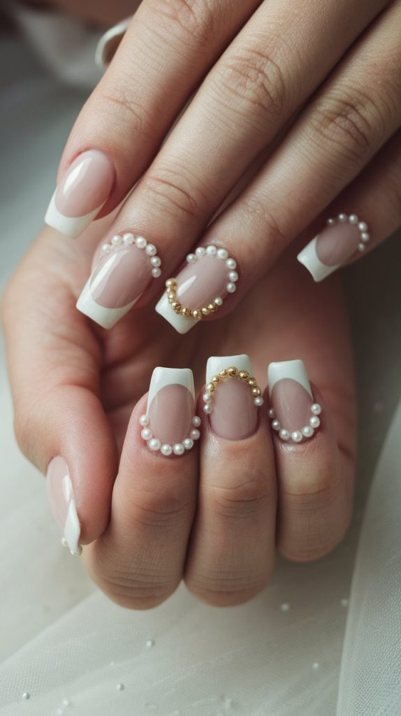 Pearls are the epitome of bridal beauty, and adding them to French tips elevates the look instantly. A delicate pearl border along the smile line gives the nails a soft, feminine, and graceful appeal.