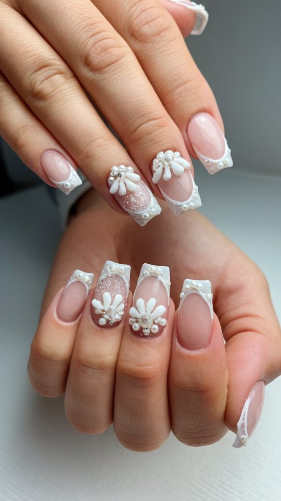 Adding 3D flowers brings a romantic, fairy-tale vibe to the traditional French tip. Small white or blush flowers placed near the tips or as accents create a whimsical bridal look.