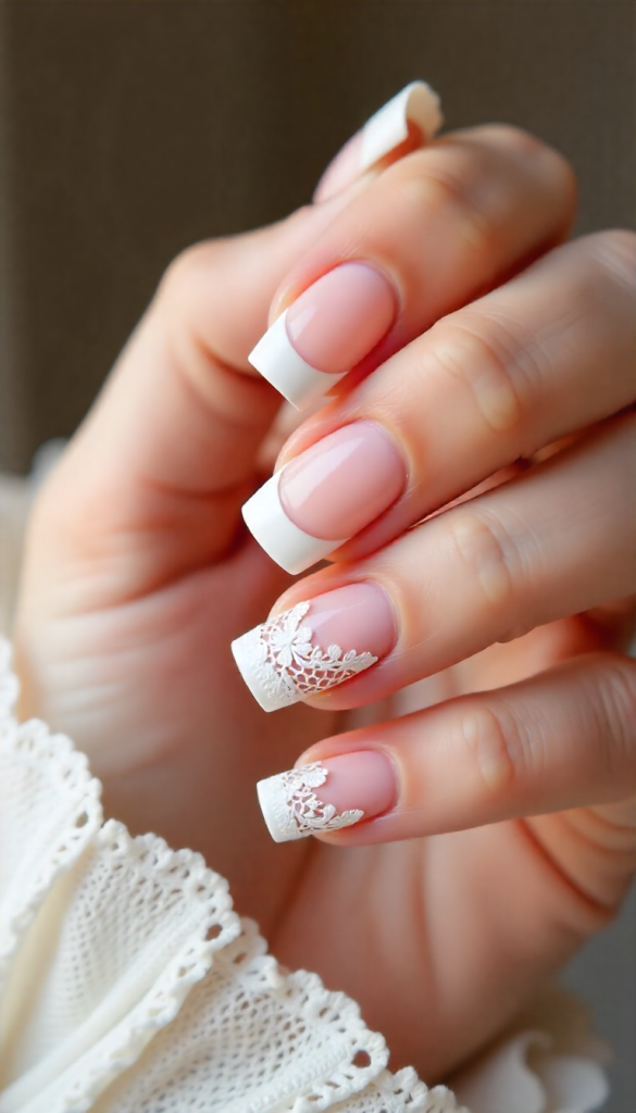 Lace detailing transforms French tips into a work of art. Soft white or ivory lace patterns painted over a sheer base mimic the texture of a bridal veil or wedding gown embroidery.