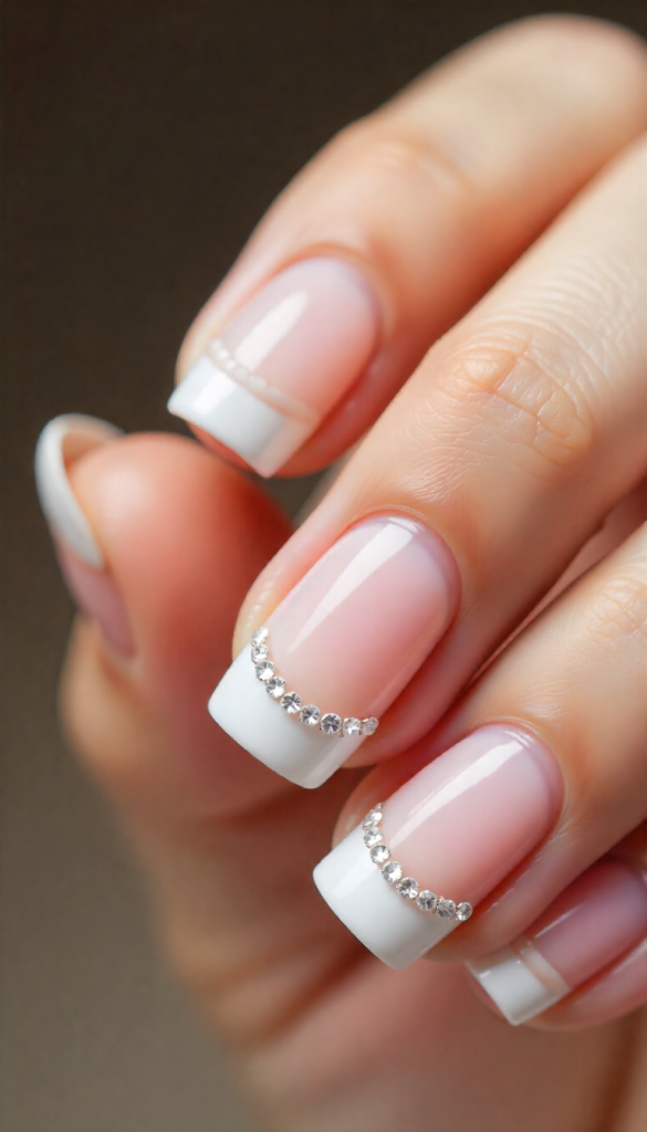 Sparkling crystals add glamorous bridal energy to French tips without overwhelming the minimal design. Just a few tiny crystals placed at the cuticle or along the smile line instantly elevate the style.