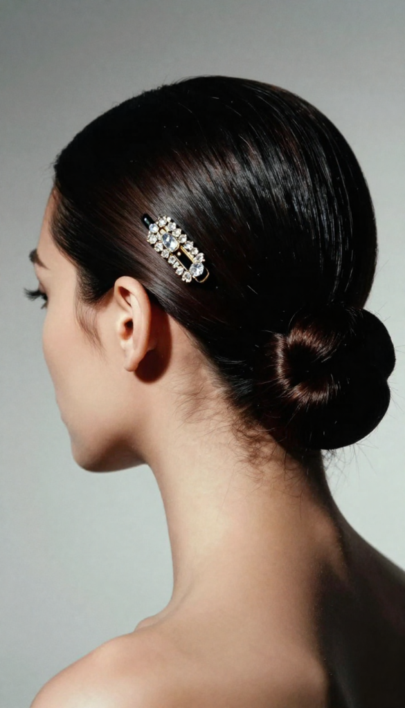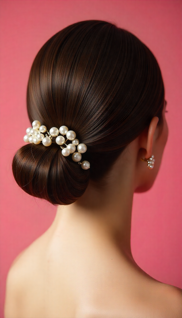 The beauty of this hairstyle lies in its simplicity. Hair is smoothly gathered and twisted into a neat chignon, often finished with a glossy shine for a polished appearance. It pairs beautifully with bold makeup and statement earrings.