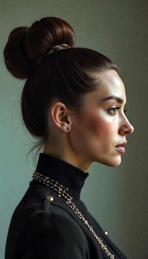The volume is key—achieved through teasing or padding—to give the bun a full, luxurious shape. Sleek sides or softly textured edges can be chosen depending on the desired finish.