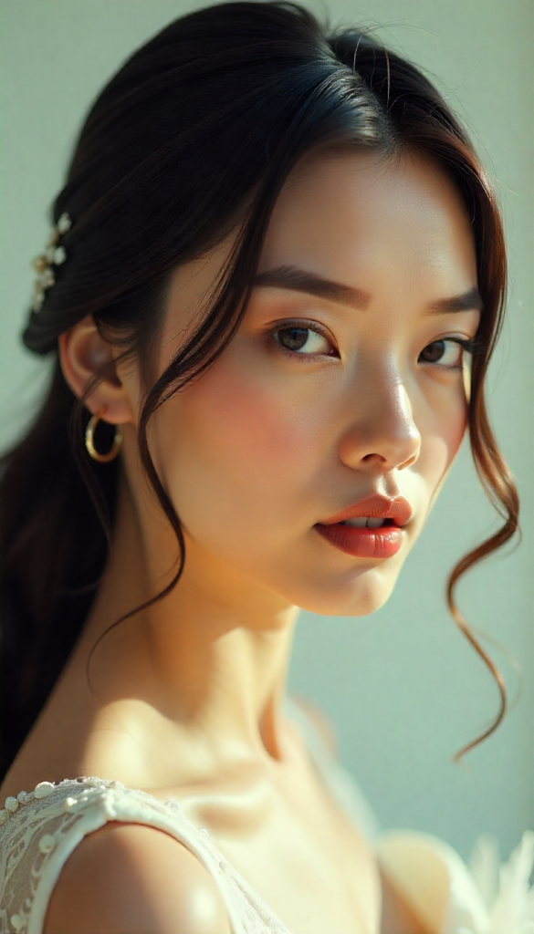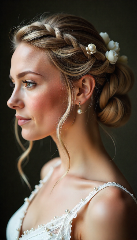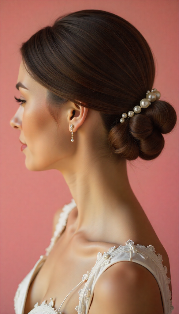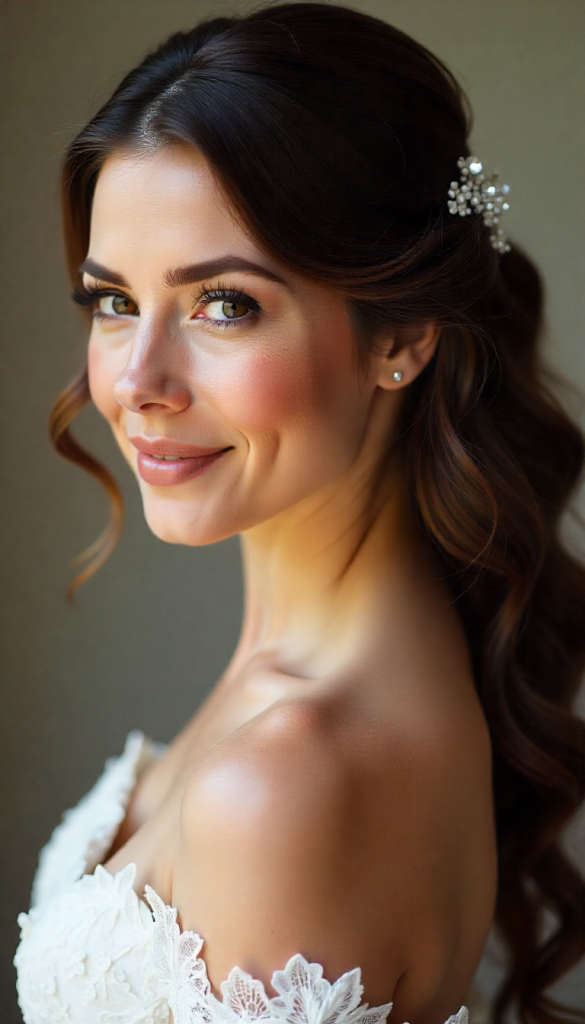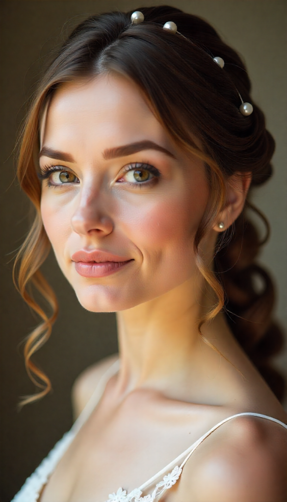 This romantic half-up style features long hair curled into loose ringlets, with the top half twisted into soft, structured lines. Floating pearl accents or tiny gem pins give the illusion that pearls are suspended in the hair. It’s dreamy, feminine, and perfect for brides who want the best of both worlds—hair down but still styled.