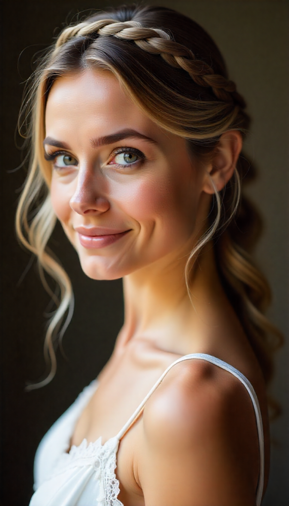 Instead of the usual boho braid, this style incorporates a sleek braided crown with a delicate satin or sheer ribbon woven through the braid. The ribbon can match the bride’s bouquet, dress details, or wedding theme. The rest of the hair is left in soft waves for a romantic finish.