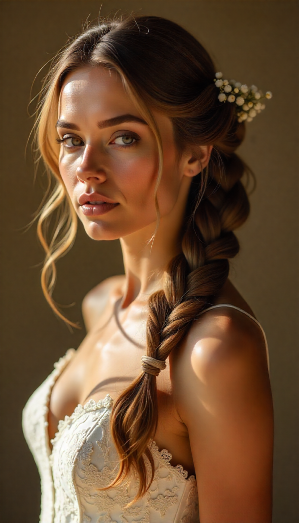For brides who love a bold hairstyle, this is a show-stopper. A thick, textured braid drapes dramatically over one shoulder, with added volume at the crown for a lifted, elegant silhouette. Small florals or metallic vines can be woven through the braid for added detail.