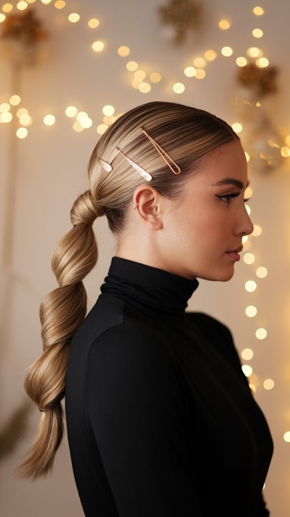 For those who love a little edge, this twisted ponytail is a modern take on the classic pony. Add golden hair cuffs or metallic clips for that festive flair.
