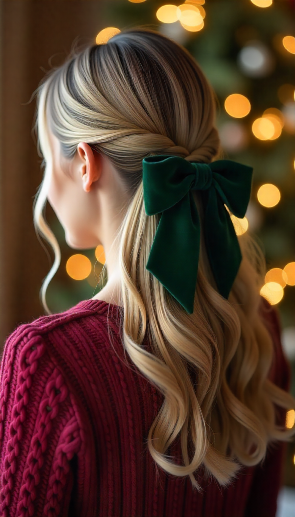 Nothing says Christmas quite like a velvet bow! This half-up hairstyle combines the playfulness of loose curls with the charm of a festive accessory.