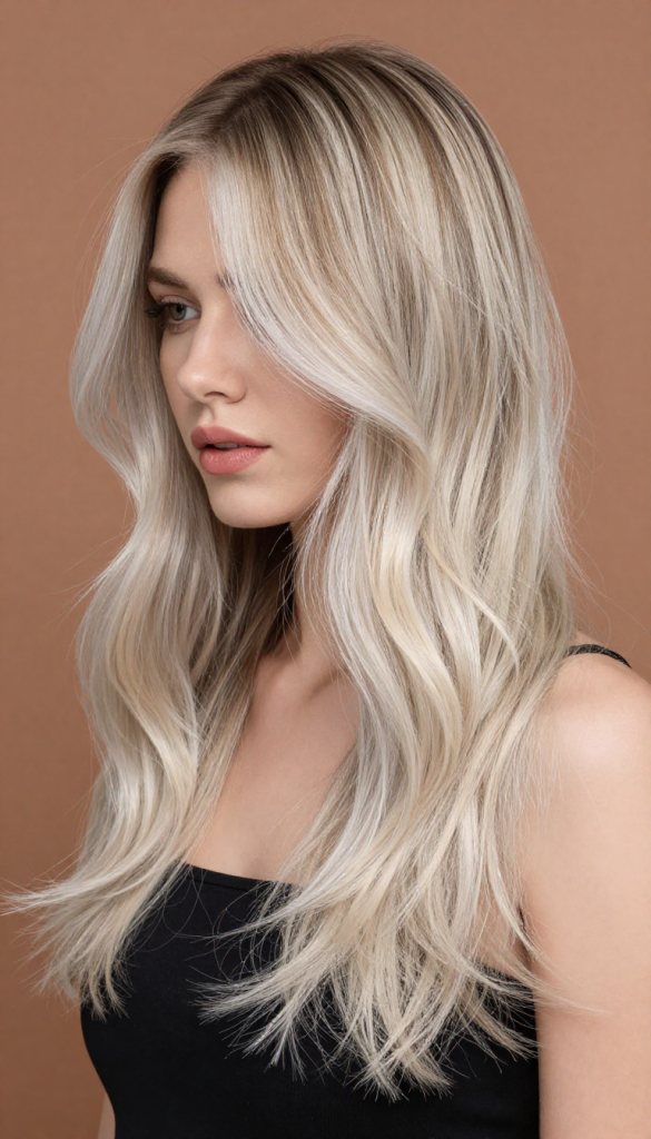 Icy blonde balayage adds dimension and softness to cool blonde tones. Instead of an all-over platinum look, this style blends darker roots into icy blonde lengths for a seamless, modern transition.