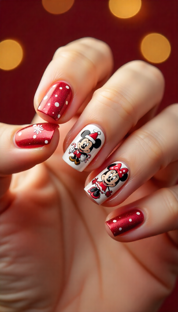 Classic red, white, and black nails featuring Mickey and Minnie in holiday outfits. Add polka dots, red bows, Christmas hats, and gold glitter to give the design a festive Disney twist.
