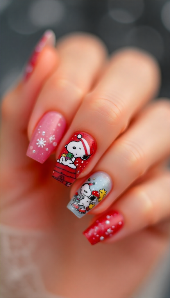 Snoopy wearing a Santa hat on crisp white or red nails creates a nostalgic holiday design. Include wrapped gifts, Christmas lights, or woodstock accents to make the style even cuter.