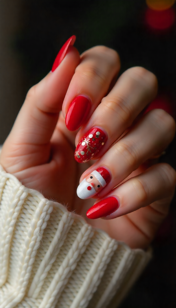 Bring the classic jolly Santa to life with bright red nails, fluffy white beard detailing, tiny black belt accents, and a hand-painted Santa face on the accent nail. Add glitter snow and candy-cane stripes for extra holiday charm.