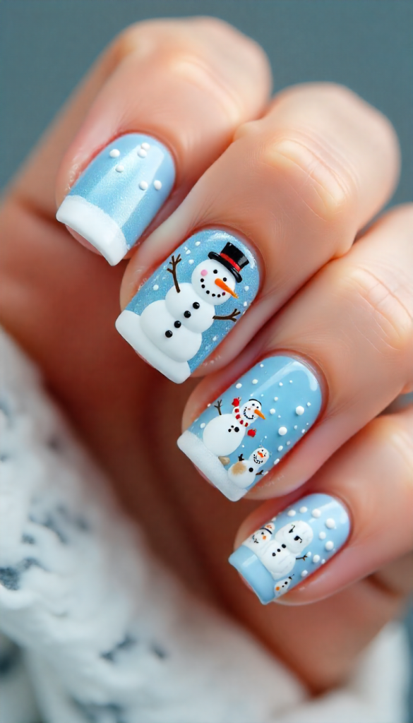 Soft winter blue backgrounds paired with adorable Frosty faces bring a cozy frosty vibe. Add carrot noses, black hats, and scarf details across the nails, finishing with icy glitter for a snow-kissed glow.
