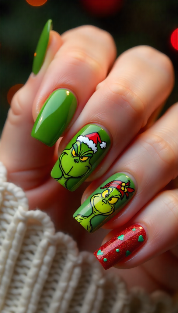 For a bold and mischievous look, choose neon green nails with hand-painted Grinch expressions. Add red ornaments, Santa hat details, and sparkly accents to capture the character’s quirky Christmas personality.