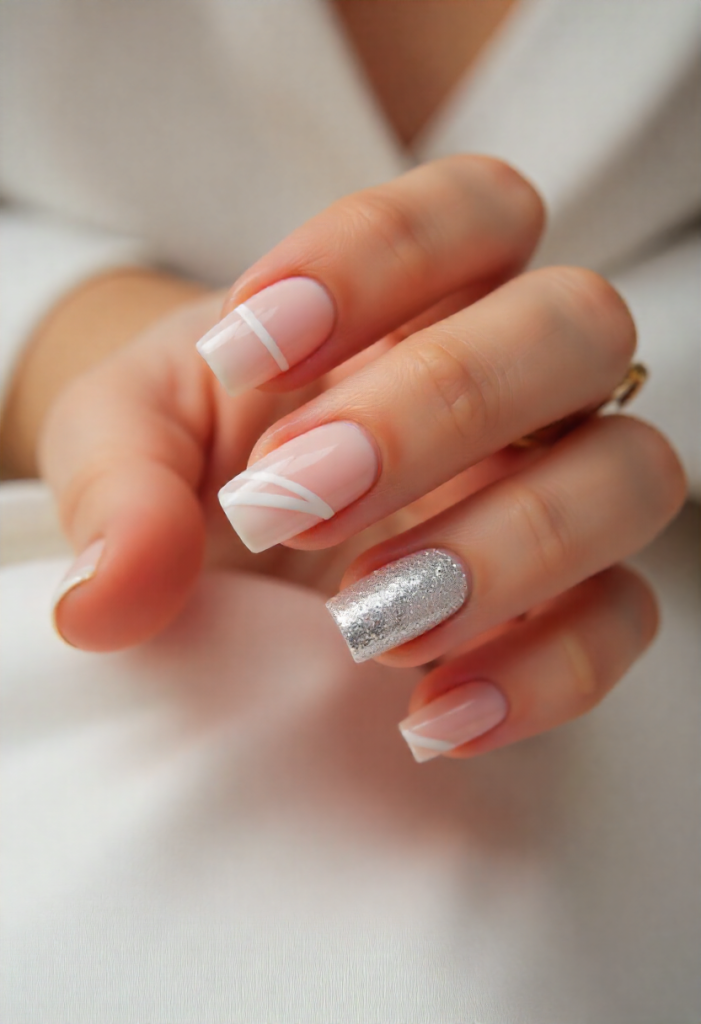 A modern French manicure with winter tones feels fresh and elevated. Think soft nude bases with silver, white, or champagne tips.