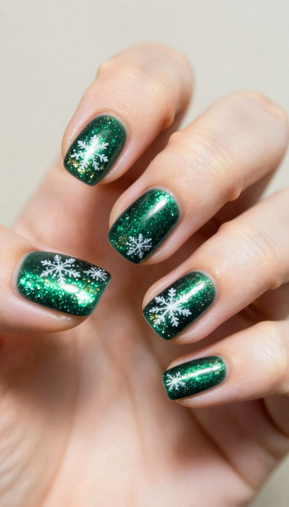 4. Emerald Green Glitter Snowflake Nails
